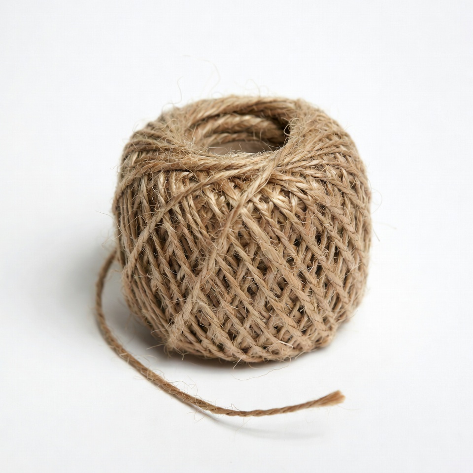 A neat ball of natural brown twine sits on a plain white background. The twine is tightly wound with a loose end trailing off to the side. Fine fibers create a textured, rustic appearance.