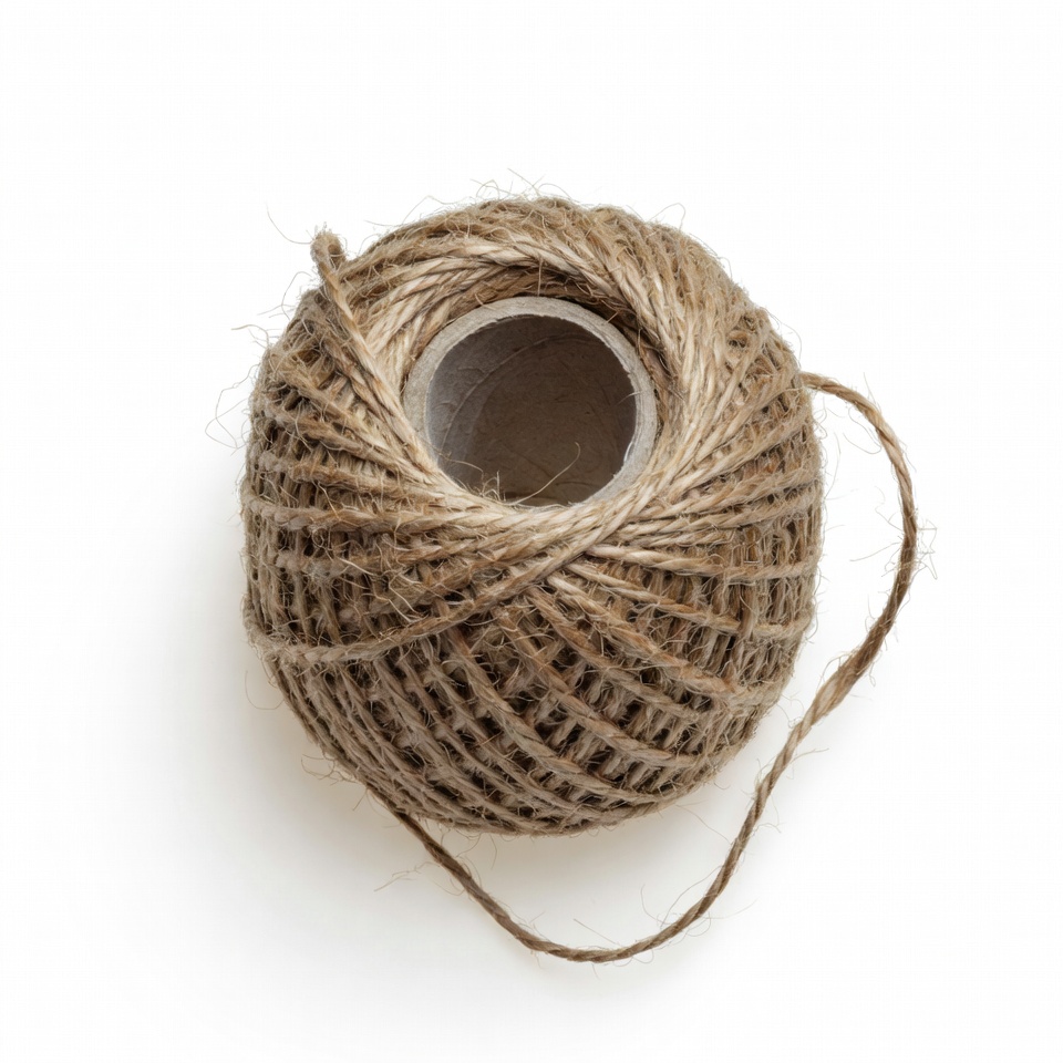 A round ball of natural brown twine sits on a plain white background. The twine is neatly wound with a visible cardboard core in the center. Loose strands of twine extend from the ball.