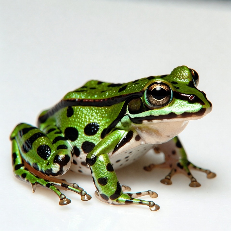 A vibrant green tree frog with black spots and golden-rimmed eyes sits on a plain white surface. Its smooth skin features bold black markings and a light throat. The frog is positioned facing forward with legs tucked under its body.