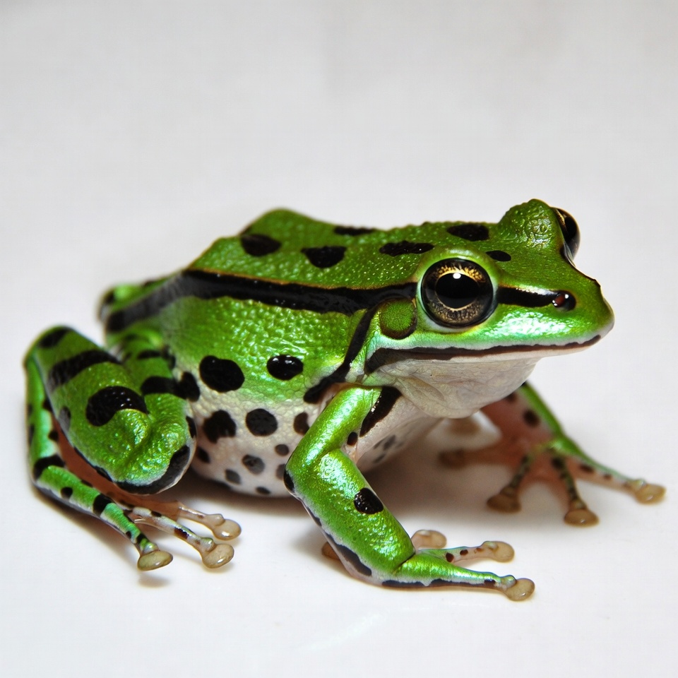 A vibrant green tree frog with black spots and white underbelly sits on a plain white background. It has large golden eyes, shiny skin, and orange toes. The frog is positioned facing forward with legs tucked under its body.