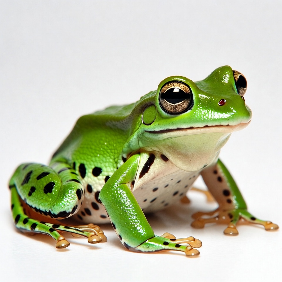 A vibrant green tree frog with large golden eyes sits on a plain white background. It features black spots on its legs and belly, with orange toes. The frog faces forward with a slight smile.