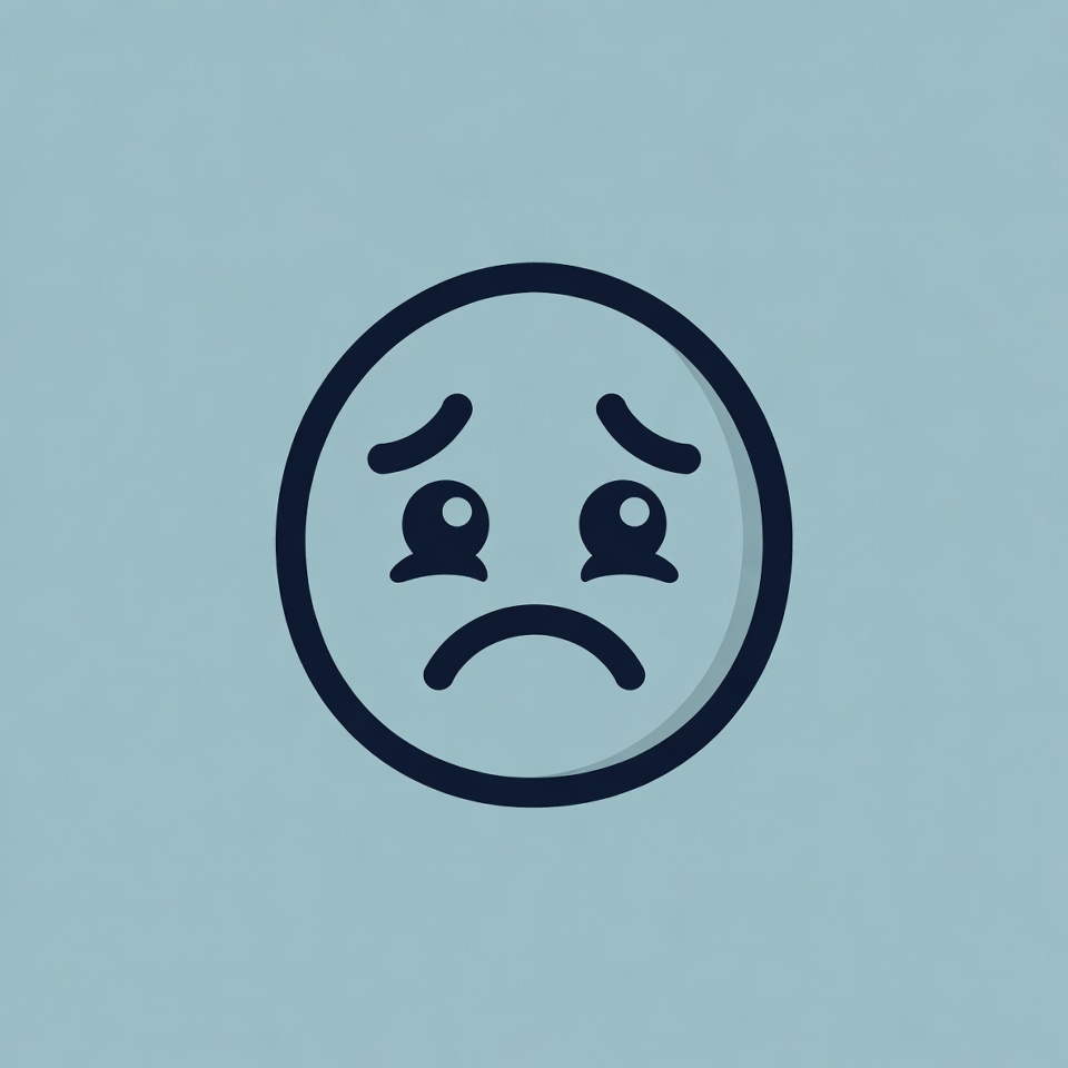 A simple line art illustration of a sad face emoji with downturned eyebrows, large teary eyes, and a frowning mouth. The black outline is set against a light blue background. Tears are depicted as small drops falling from the eyes.