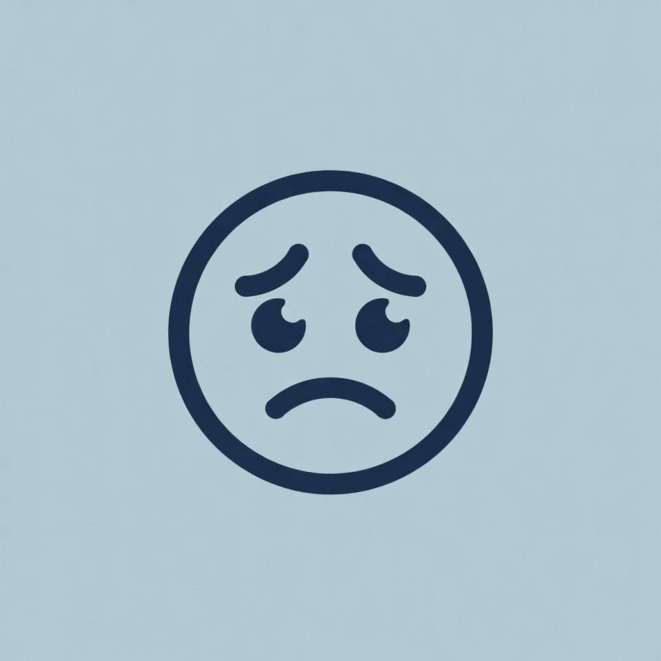 A simple line art illustration of a sad face emoji with downturned eyebrows and a frowning mouth. The dark blue outline is set against a light blue background. The eyes are large and expressive, conveying sadness.
