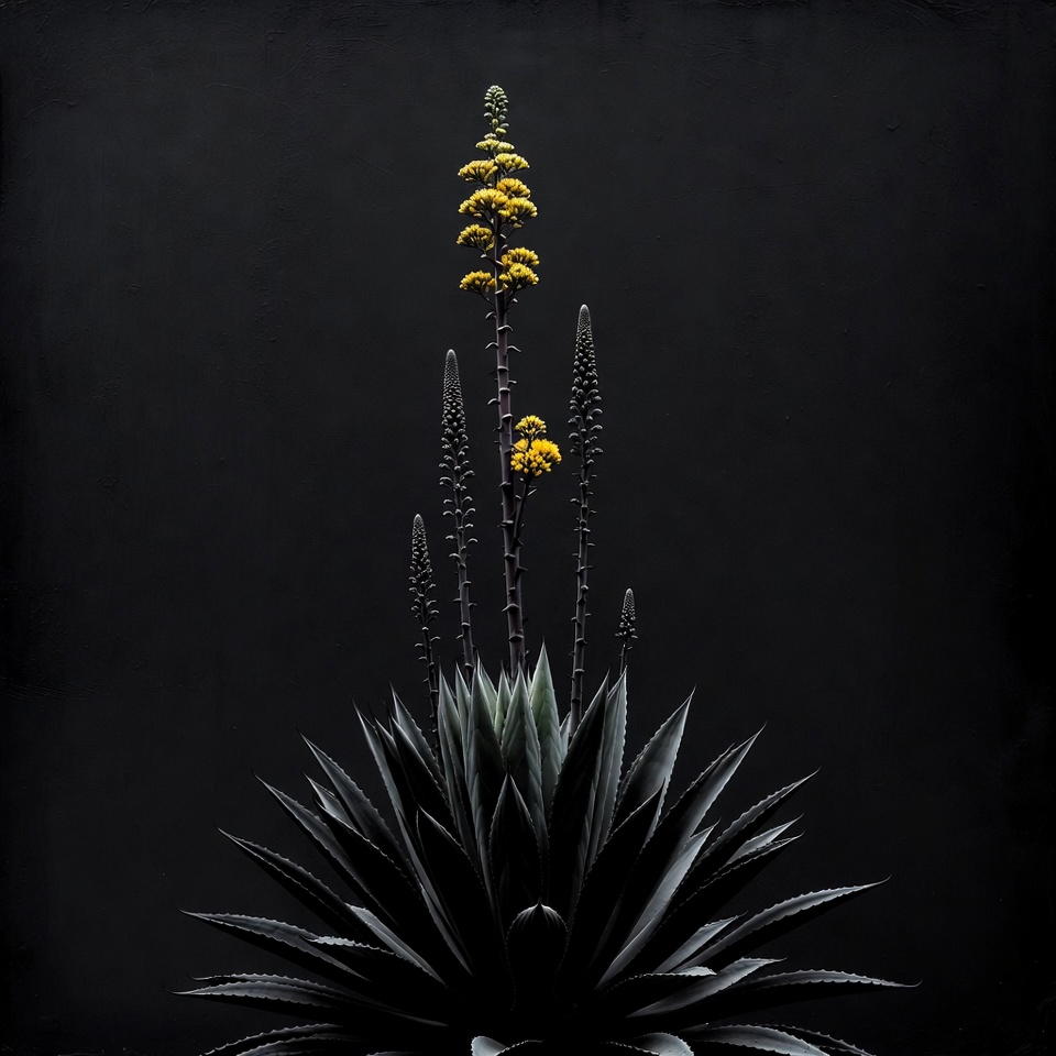 agave, black background, blue-green leaves, botanical, dark rosette, desert plant, flower spikes, isolated, nature, plant, spiky leaves, succulent, tall stalks, vibrant yellow, yellow flowers, agave plant