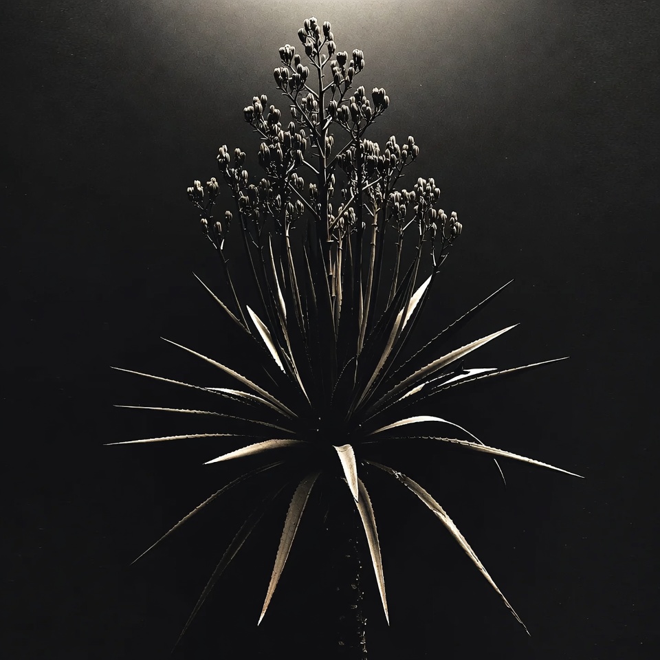 A tall agave plant with long, spiky leaves radiating from the center is captured in black and white. A prominent flower stalk topped with buds rises from the rosette against a dark background. The image features high contrast lighting highlighting the plant's textures and form.