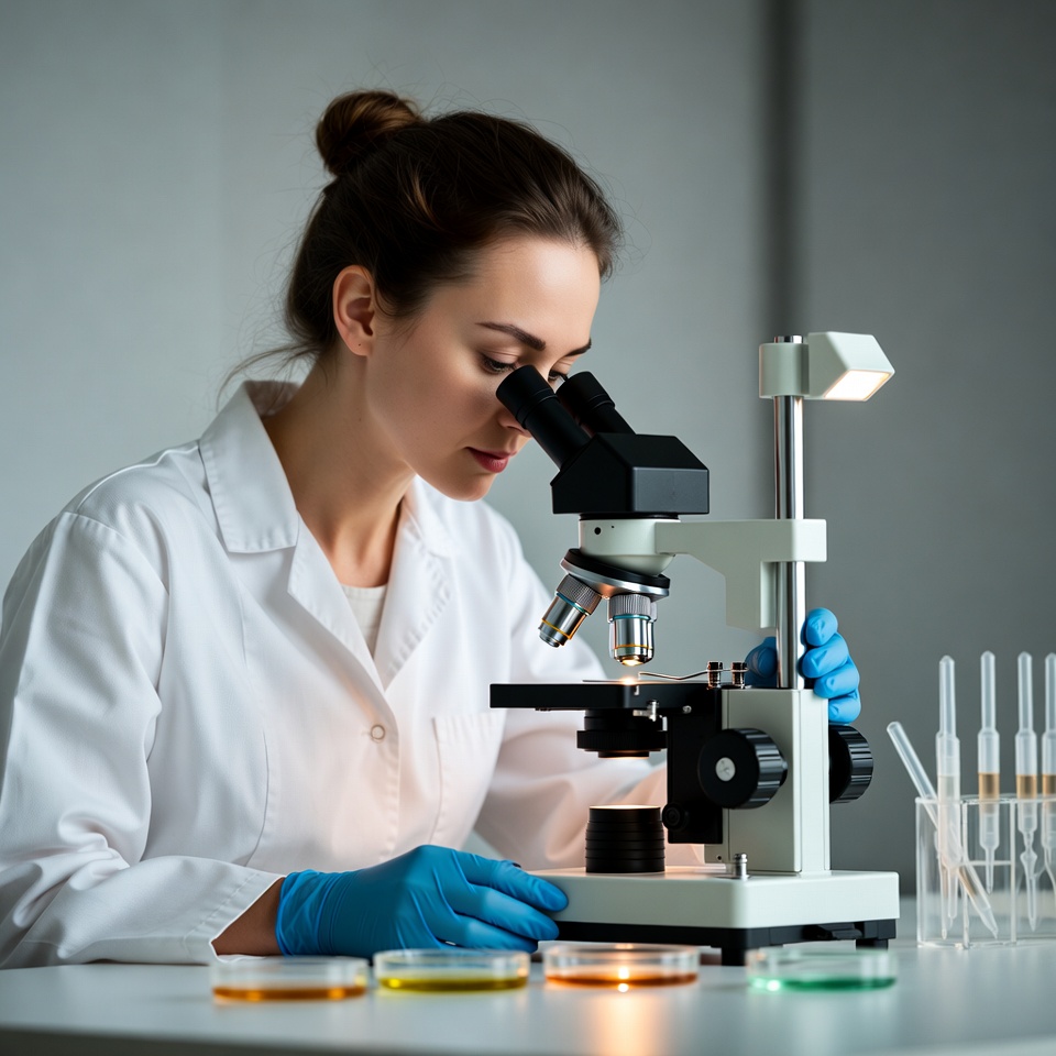 A woman with dark hair in a bun wears a white lab coat and blue gloves while peering into a microscope. She is seated at a lab bench with colorful petri dishes containing bacterial cultures and test tubes nearby. The setting is a clean laboratory environment.