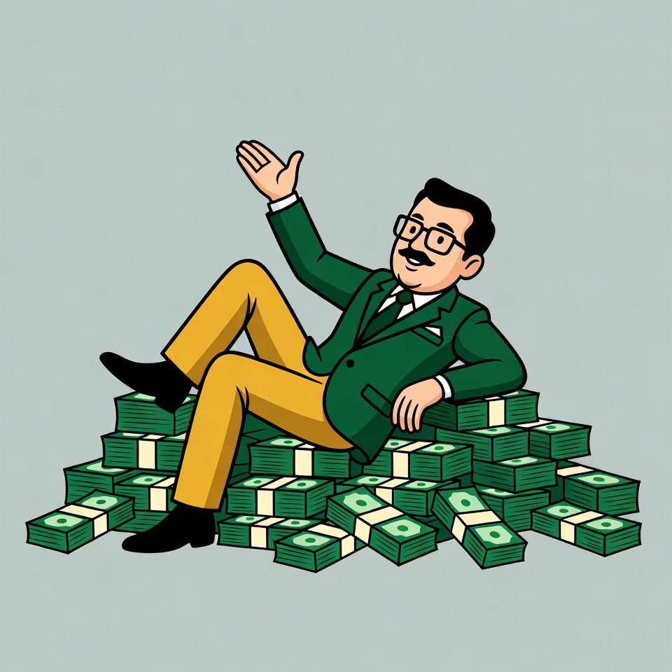 A cartoon man with glasses and mustache lounges on a large pile of cash. He wears a green suit jacket, yellow pants, and black shoes, raising one hand while smiling. The illustration features a simple gray background.