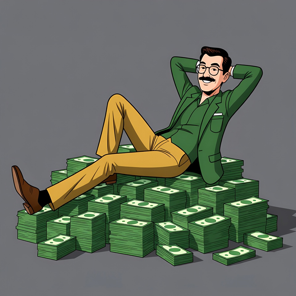A cartoon man with glasses and a mustache lounges relaxed with hands behind his head on a large pile of cash. He wears a green suit jacket, yellow pants, and brown shoes. The image features a simple gray background.