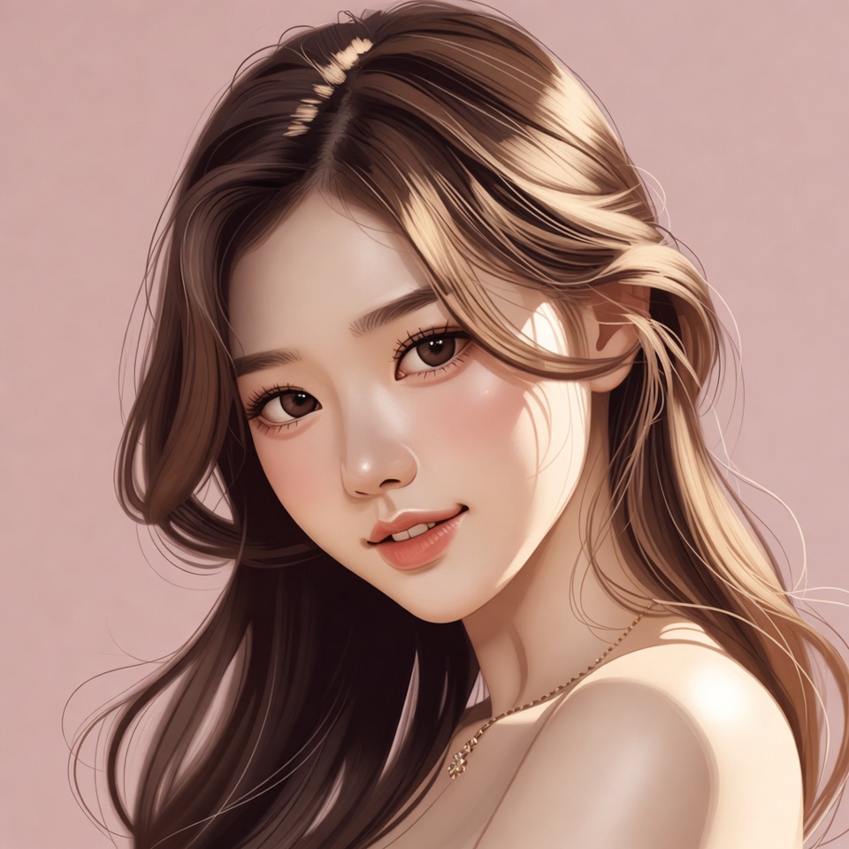 A young Asian woman with long wavy brown hair gazes at the viewer with a gentle smile. She has soft, glowing skin, large expressive eyes, and subtle makeup with pink blush on her cheeks. She wears a delicate necklace and is rendered in a detailed digital illustration style against a pink background.