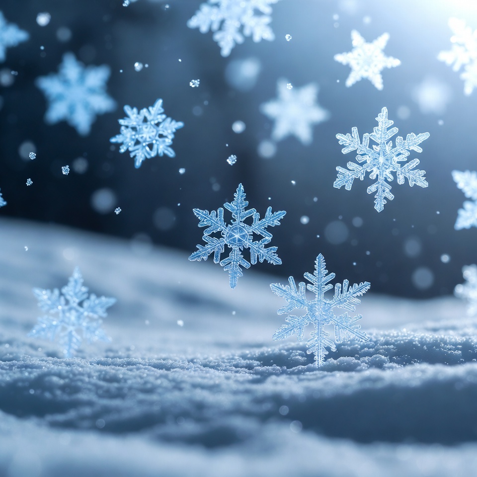 Numerous delicate snowflakes fall gently over a snowy landscape. The scene features a dark blue background with sparkling light effects and a layer of fresh snow at the bottom. The snowflakes vary in size and are captured in mid-air with a realistic, glistening appearance.