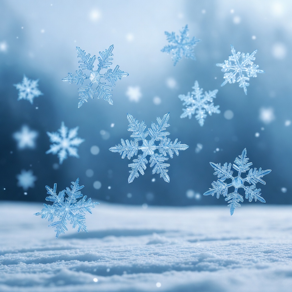 Multiple delicate blue snowflakes float gently above a soft snowy ground. The background features a blurred snowy landscape with a cool blue tint. The image has a dreamy, ethereal quality with scattered sparkling snow particles.