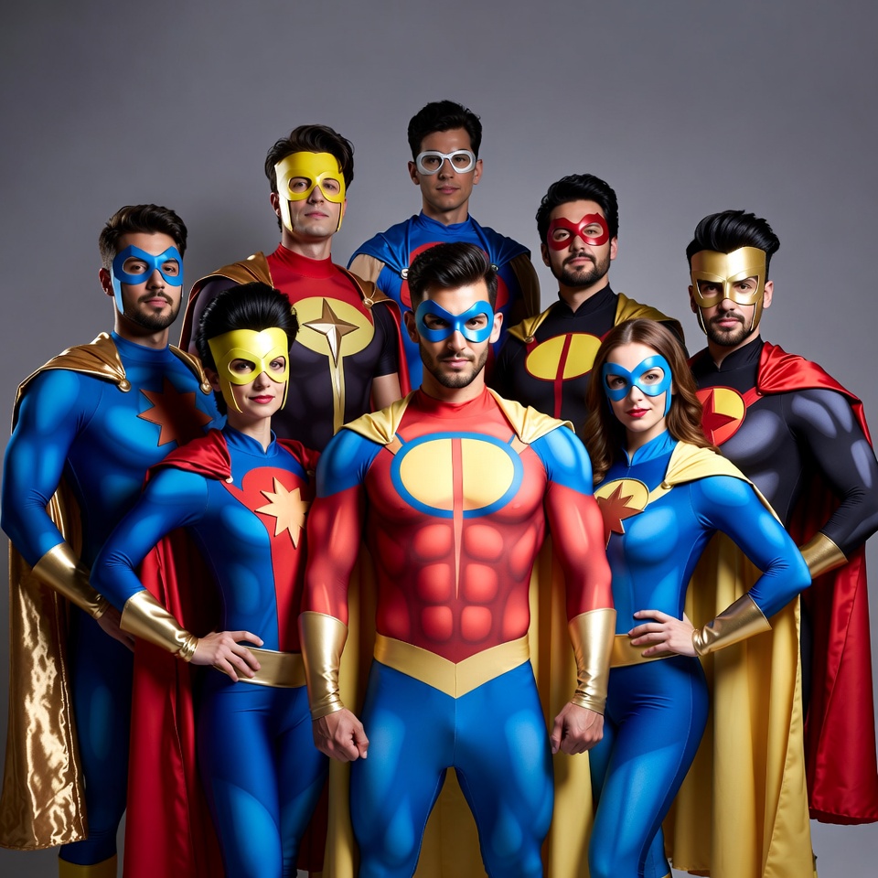 A diverse group of men and women dressed as superheroes in vibrant costumes including red, blue, yellow, and multicolored suits with capes and masks stand together on a gray background. The central male figure wears a red and blue muscular superhero outfit with a prominent emblem. They strike dynamic poses with hands on hips, showcasing their bold and varied designs.