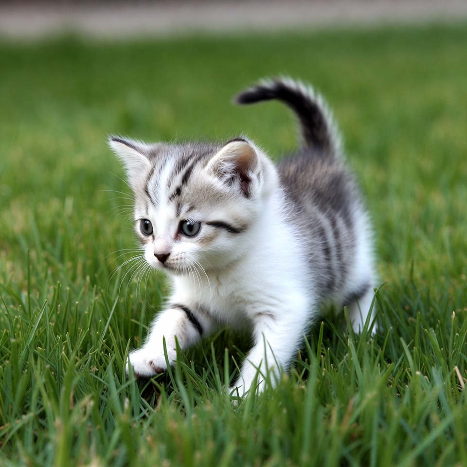 A small tabby kitten with gray and white stripes crawls playfully on lush green grass. Its blue eyes are wide open, and its fluffy tail is raised high. The kitten extends its front paws forward while crouching low.