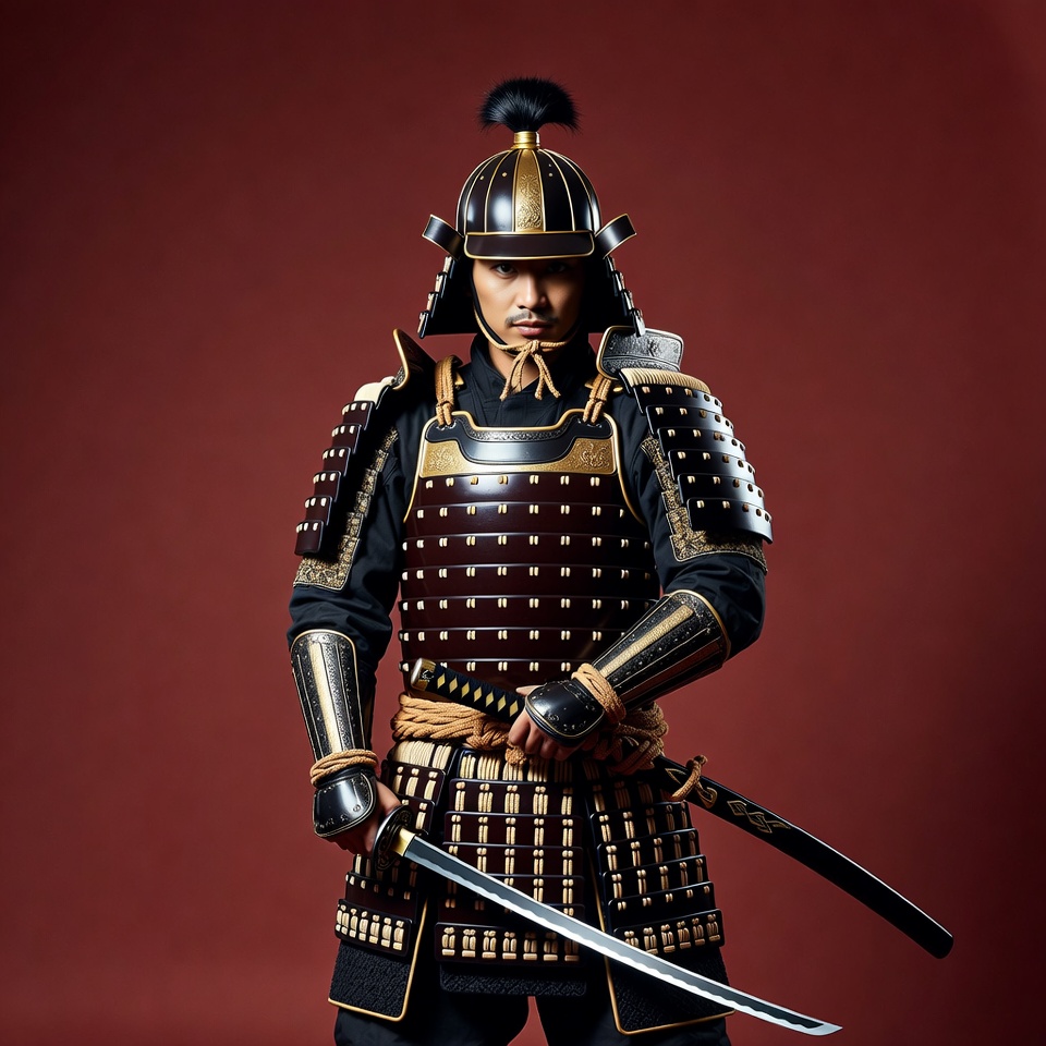 Asian, Japan, Japanese, armor, black armor, blade, fighter, gold accents, helmet, historical, isolated background, kabuto, katana, male, man, red background, standing pose, swords, topknot, traditional, warrior, samurai