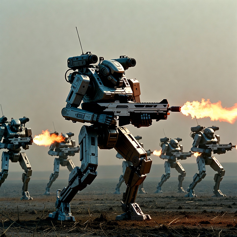 backpack, barren landscape, battle robots, cyberpunk, desert background, digital art, firing weapons, flames, futuristic robots, guns, illustration, mechs, metallic armor, muzzle flash, rifles, robot helmet, robot squad, robots, sci-fi robots, combat robots