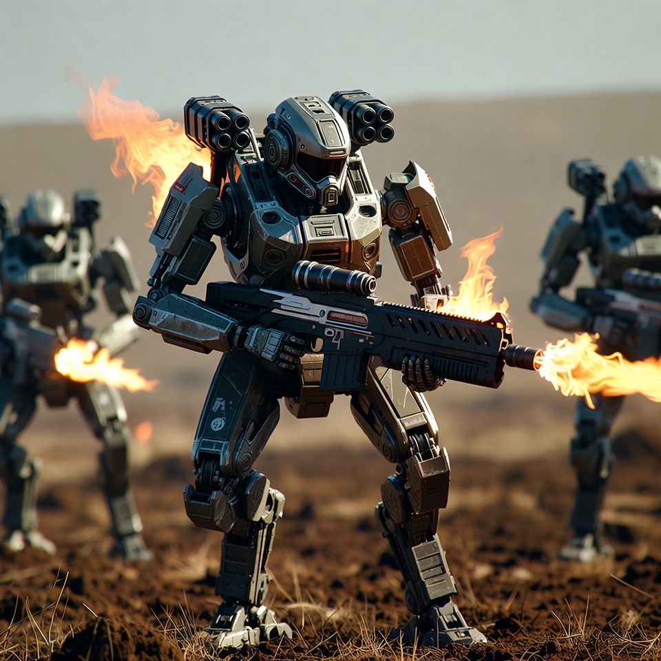 action pose, barren field, combat robots, desert landscape, dry grass, firing flames, flamethrower, futuristic armor, gray armor, heavy plating, illustration, mech, muzzle flash, orange fire, rifle, robots, rockets, sci-fi, shoulder launchers, mecha robot