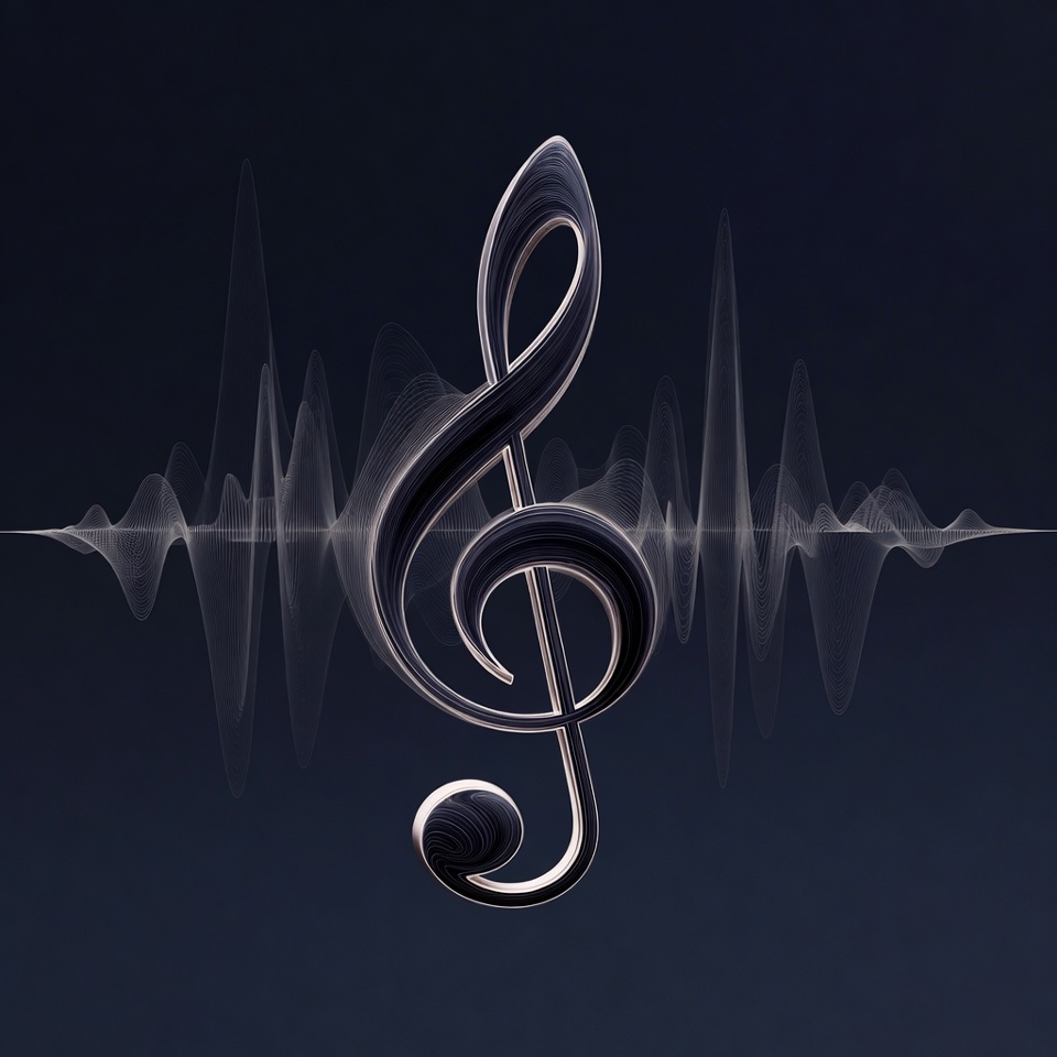 A glossy 3D treble clef symbol floats against a dark blue background. White wavy sound waves curve around and behind the metallic black clef. The design features smooth gradients and shiny highlights for a dynamic effect.