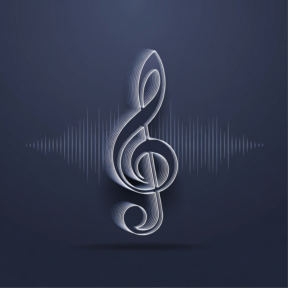 A white 3D treble clef symbol glows against a dark navy background. Subtle sound wave lines emanate from its base, creating a musical effect. The design features smooth gradients and outlines for a modern, illuminated look.