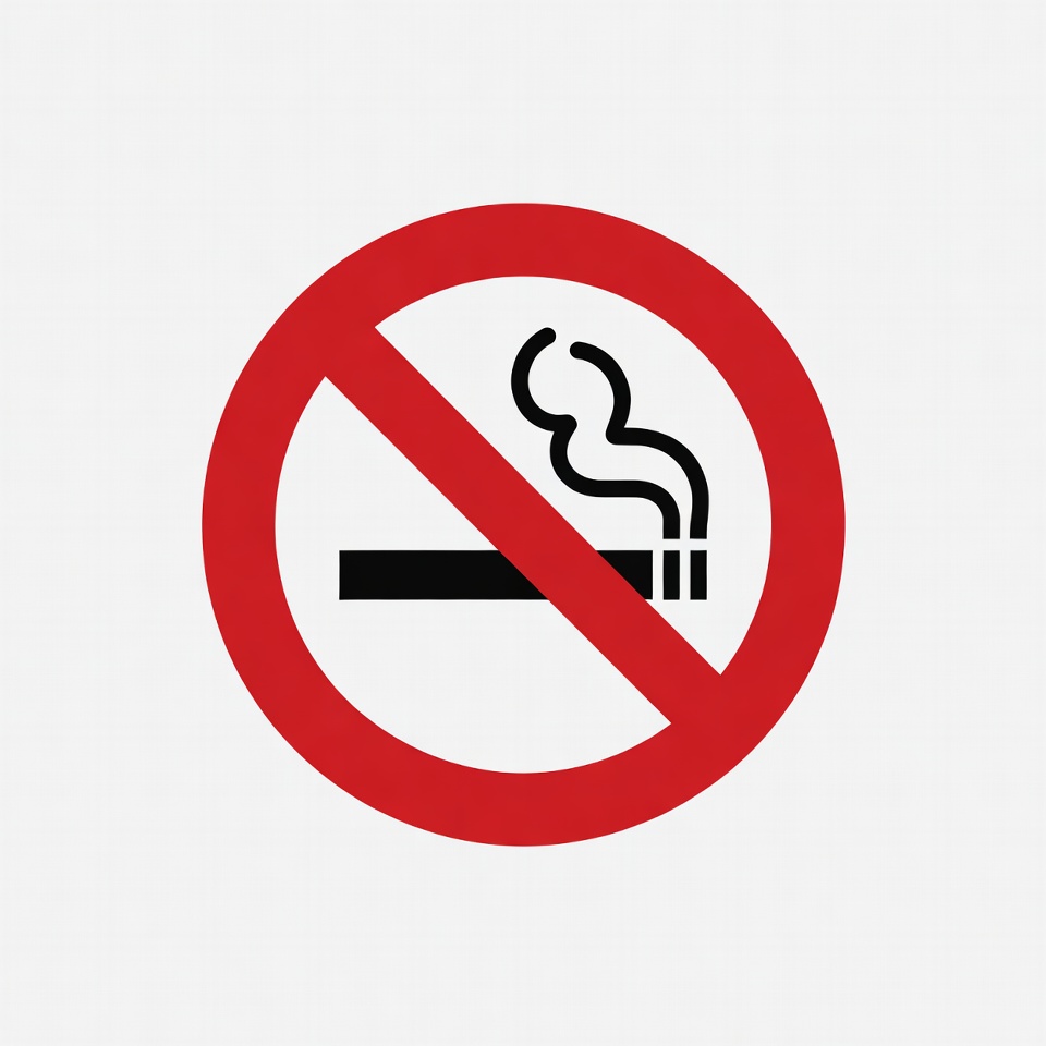 A red circular prohibition sign features a black cigarette with smoke crossed out by a diagonal black slash. The icon is simple and bold against a white background. It clearly indicates smoking is not allowed.
