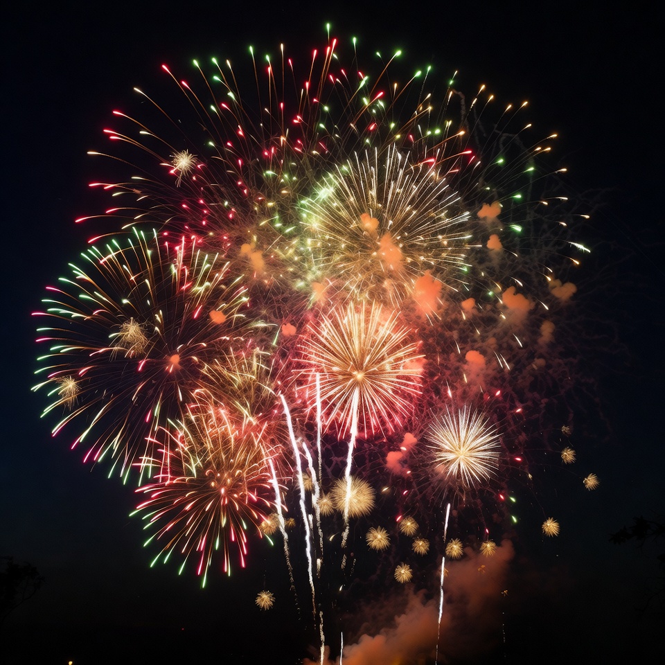 burst fireworks, celebration fireworks, colorful fireworks, dark background, exploding fireworks, festival fireworks, green fireworks, light trails, night sky, orange fireworks, pyrotechnics, red fireworks, spark trails, vibrant colors, yellow fireworks, fireworks