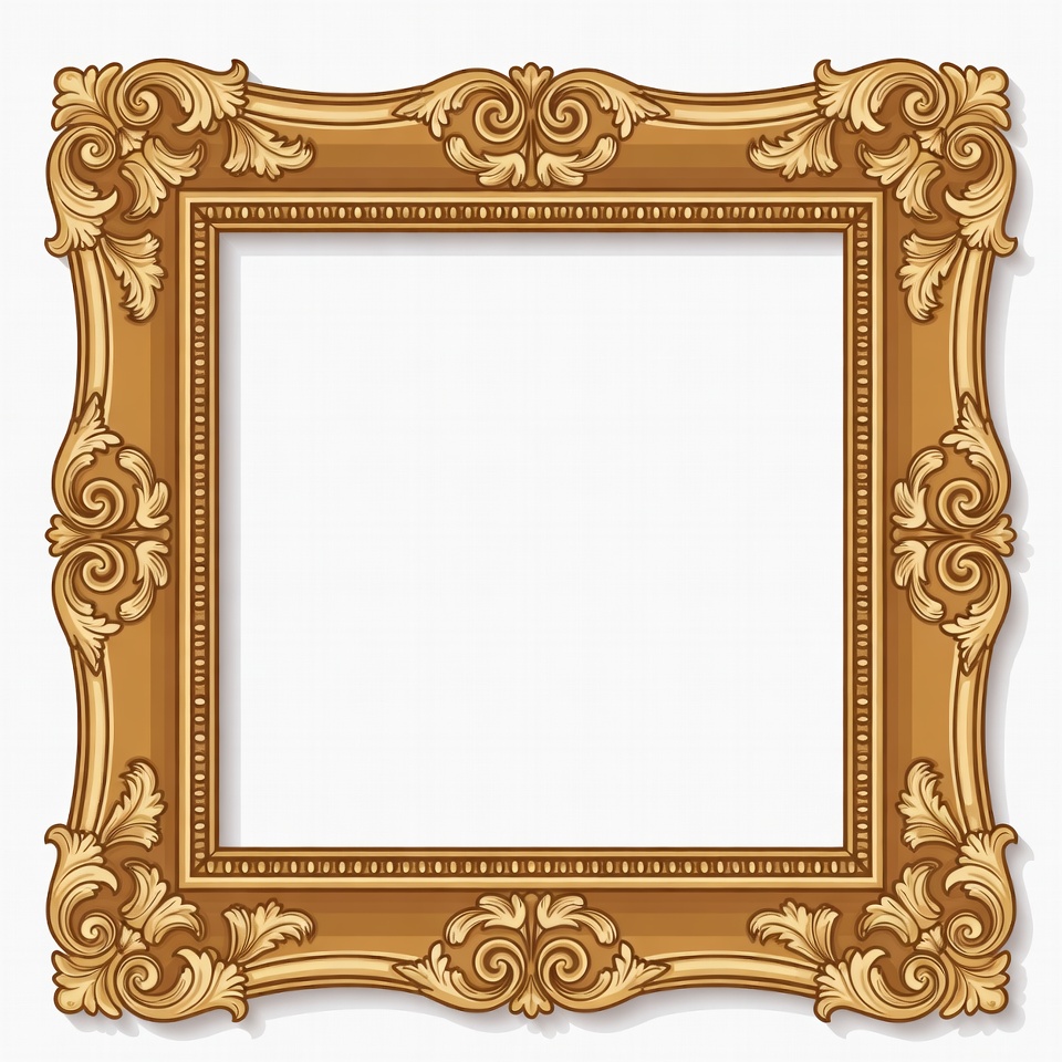 baroque frame, clipart, decorative frame, empty frame, filigree, floral design, gold frame, golden frame, illustration, isolated background, ornate frame, scrollwork, vintage frame, white background, picture frame