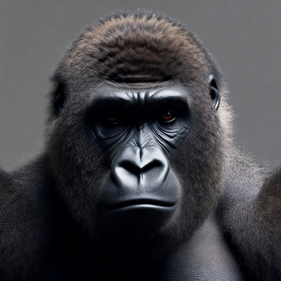 animal, ape, black skin, brows, close-up, dark fur, face, gray background, headshot, intense stare, lips, mammal, monkey-like, nose, portrait, powerful, primate, realistic, red eyes, serious expression, silverback, wild animal, wildlife, zoo animal, gorilla