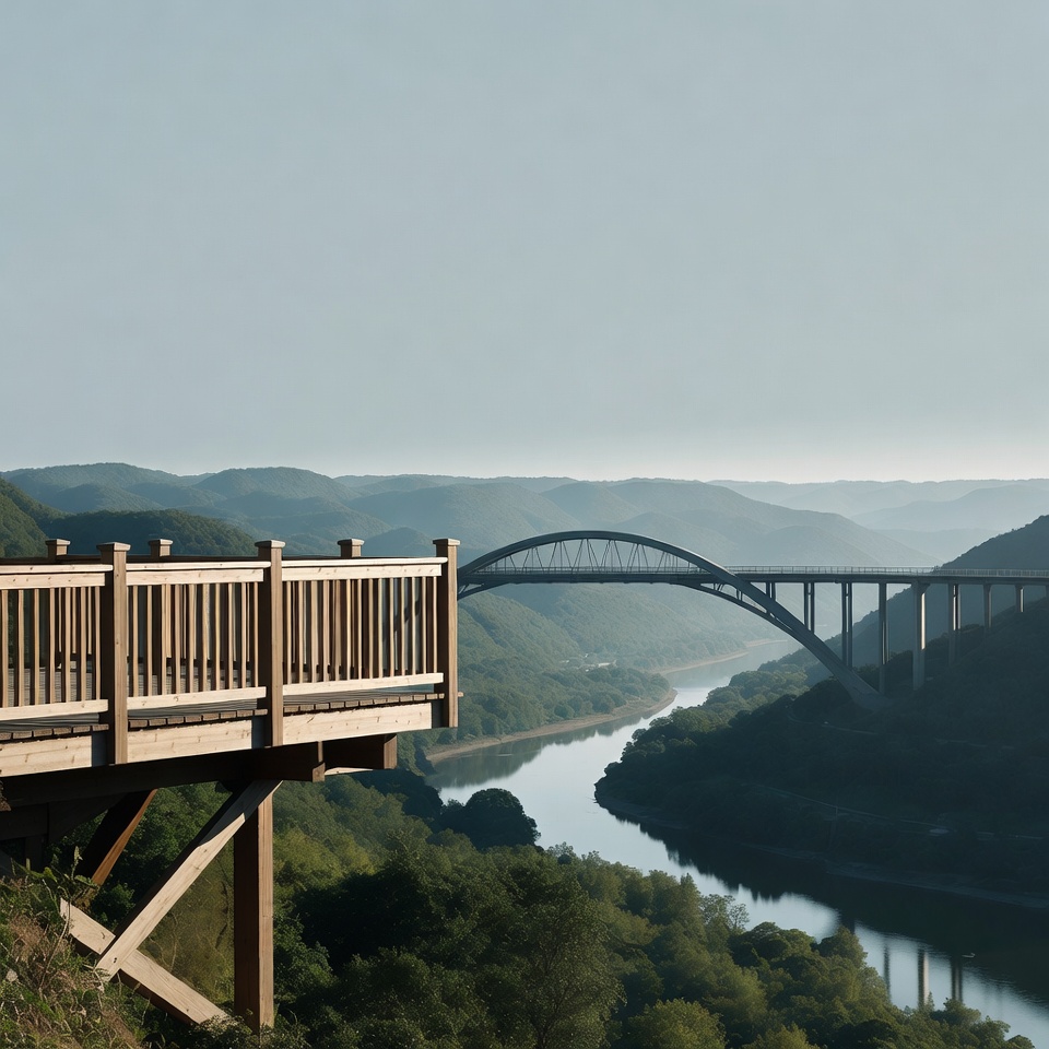 arch bridge, bridge view, elevated deck, forest, green hills, landscape, lush greenery, misty mountains, mountains, nature, observation platform, railing, river, river valley, scenic overlook, suspension bridge, valley, viewpoint, wooden structure, wooden deck