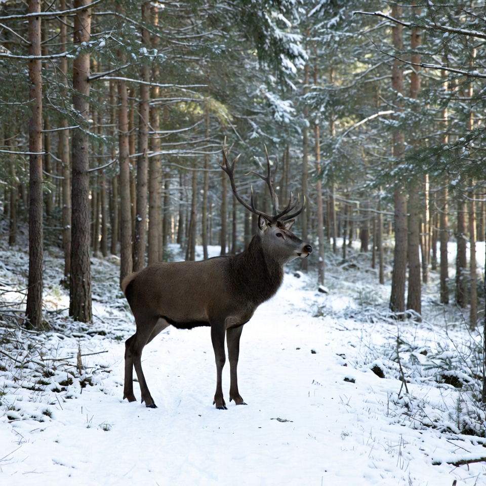 A majestic red deer with large antlers stands alert in a dense pine forest covered in snow. The deer's reddish-brown coat contrasts with the white snow blanketing the ground and trees. Snow dusts the branches of the evergreen trees surrounding the animal.