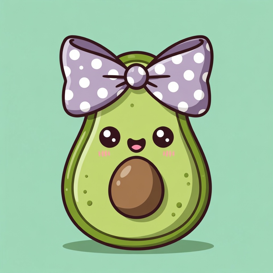 A kawaii-style cartoon avocado features large sparkling eyes, a smiling mouth, and a large purple polka dot bow on top. The avocado has a shiny green skin and a brown pit visible in the center. It is illustrated on a light green background.