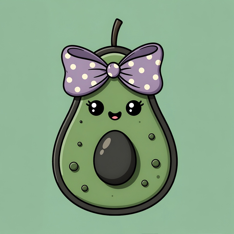 A kawaii-style cartoon avocado features a happy face with big sparkling eyes and a smiling mouth. It wears a purple polka-dot bow on its stem and has a shiny black pit visible in its textured green flesh. The illustration is set against a solid mint green background.