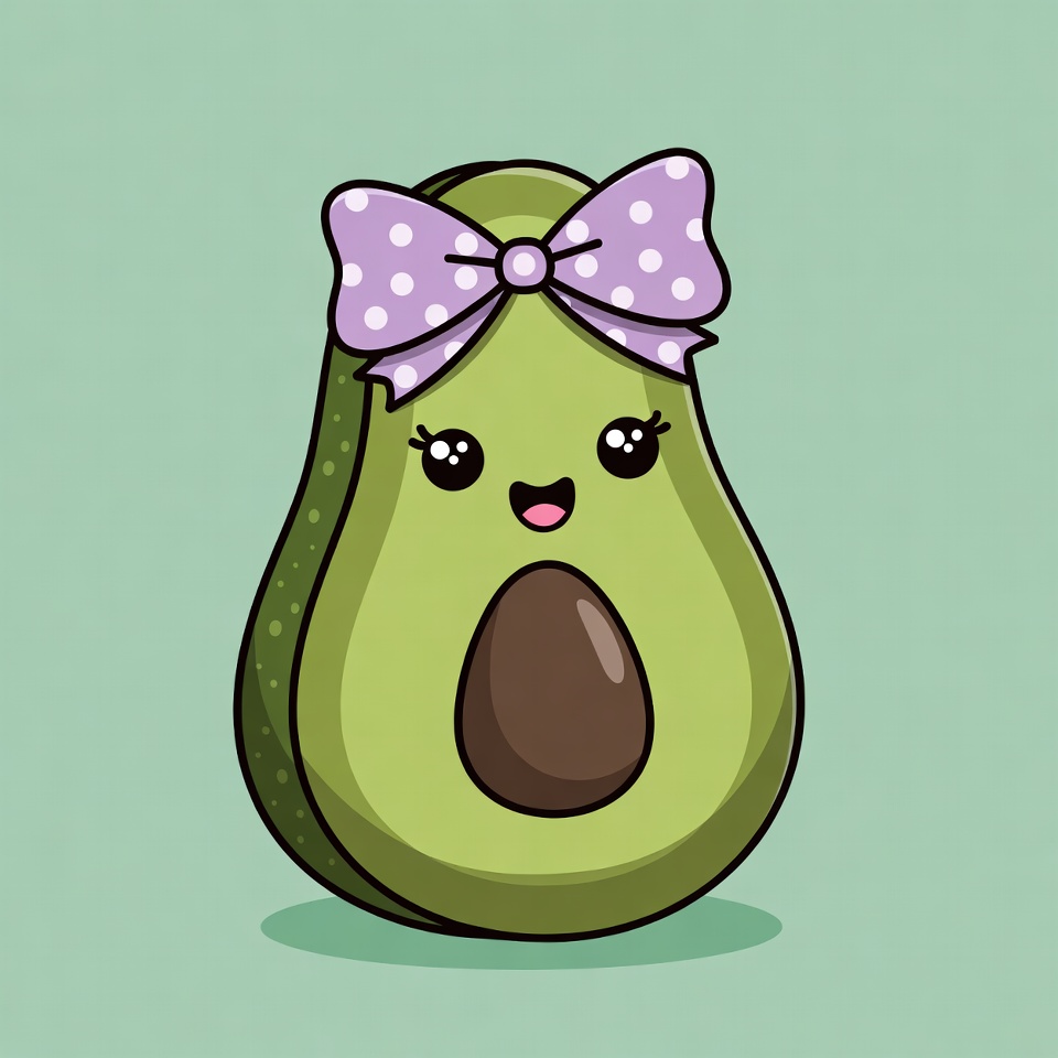 A kawaii-style cartoon avocado features a shiny green body with a large brown pit and a polka-dotted purple bow on top. It has big sparkling eyes, rosy cheeks, and a wide smiling mouth. The illustration is set against a light green background.
