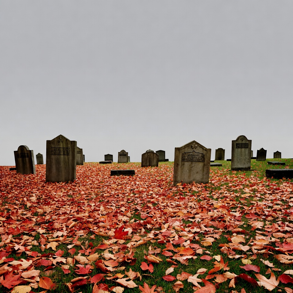 autumn cemetery, autumn leaves, burial ground, fall foliage, fallen leaves, foggy sky, gravestones, graveyard, gray sky, isolated background, leaf covered, orange leaves, overcast, red leaves, stone markers, tombstones, cemetery