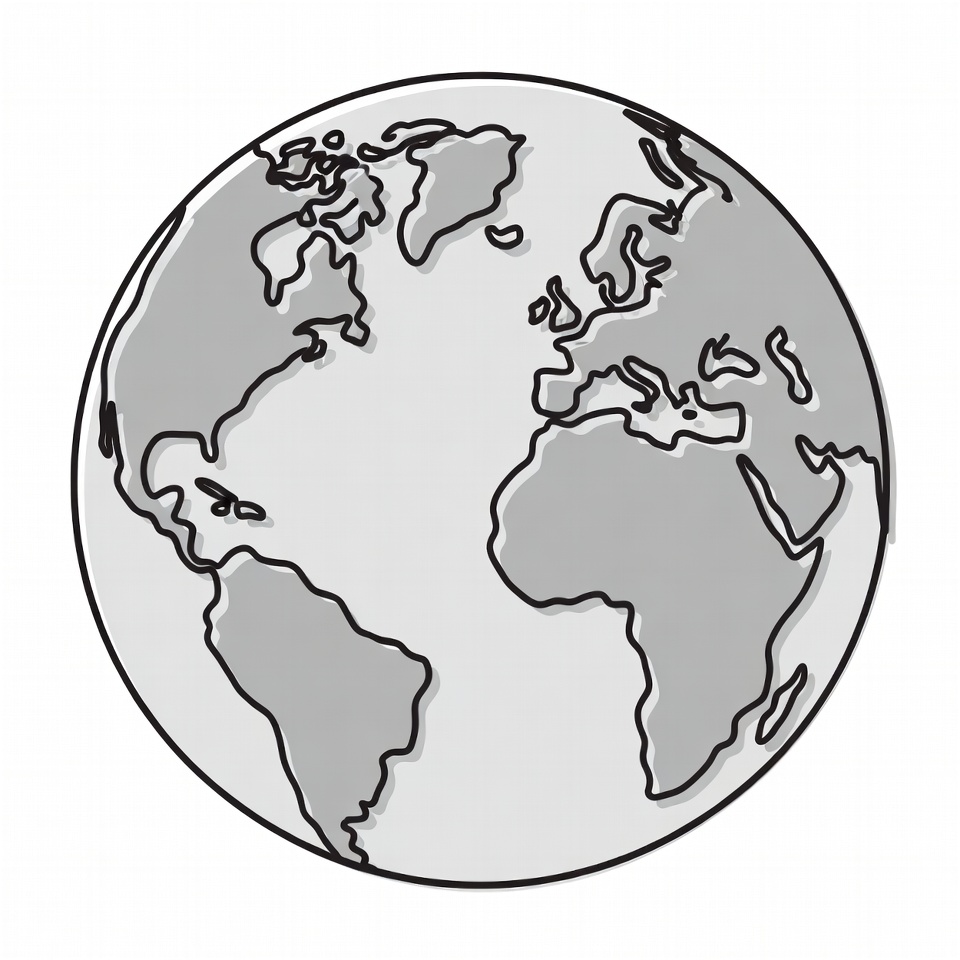 Africa, Earth, Europe, North America, South America, black and white, clipart, continents, illustration, isolated background, line drawing, outline, planet, world map, globe