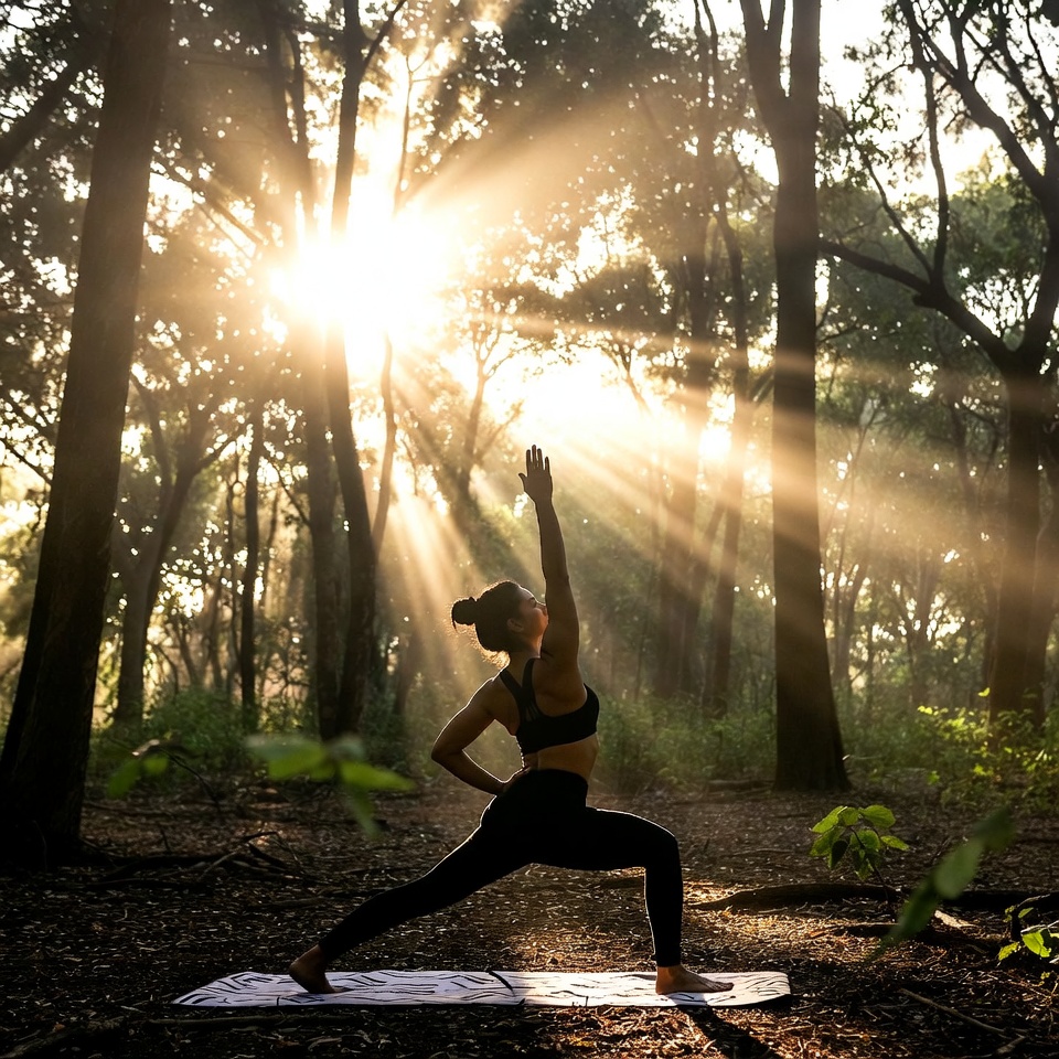 A woman with hair in a bun performs a warrior yoga pose on a mat in a dense forest. She wears a black sports bra and leggings, standing with one leg extended back and arms raised. Sunlight rays filter through the tall trees, illuminating the green foliage and forest floor.