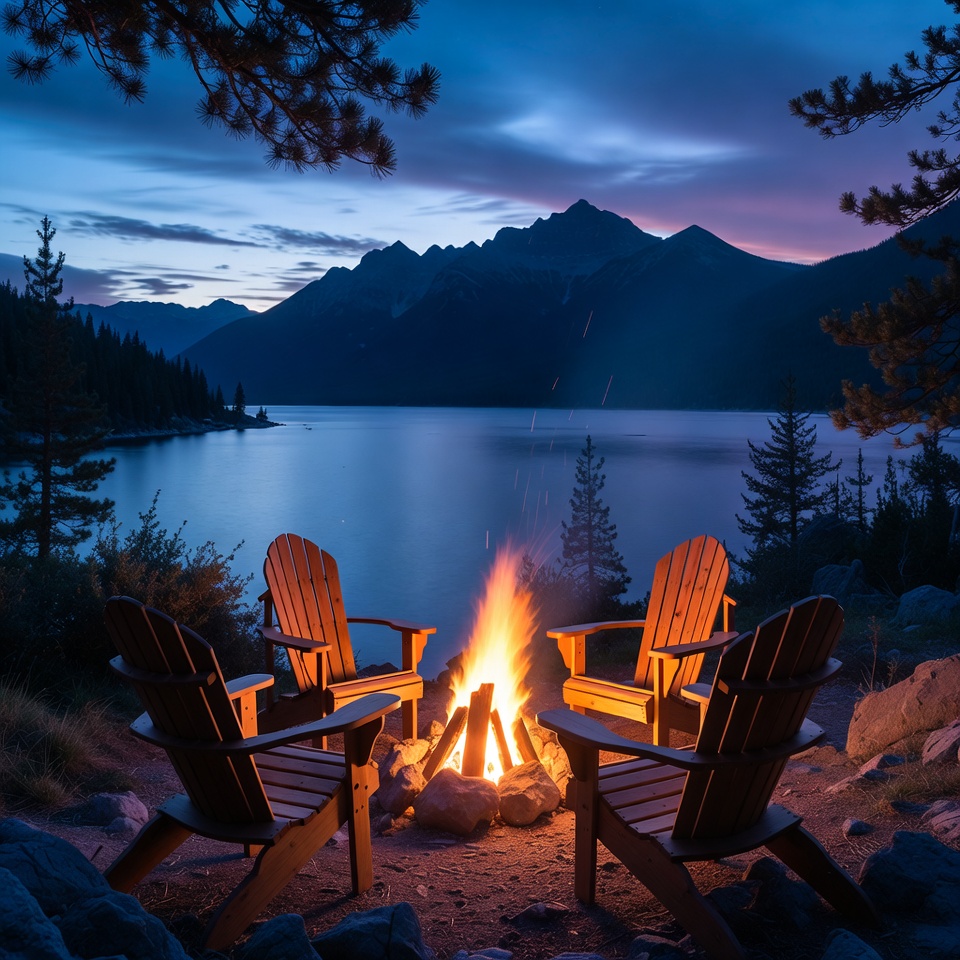 Adirondack chairs, alpine view, blue sky, calm water, camping, cozy fire, dusk, fire glow, flames, forest, lake shore, landscape, mountain lake, nature, night sky, outdoor scene, pine trees, purple sky, rocks, serene lake, snowy mountains, twilight, vacation spot, wilderness, wooden chairs, campfire