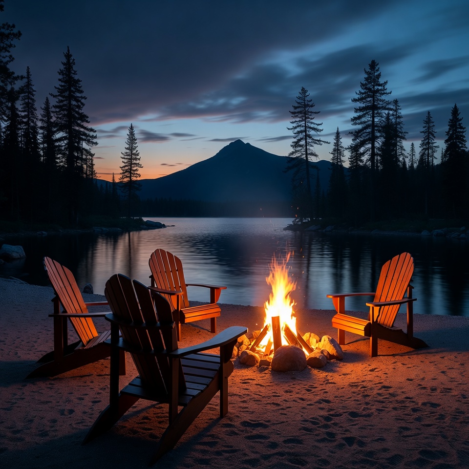 Adirondack chairs, beach, bonfire, camping, clouds, dusk, evening, fire, flames, forest, isolated background, lake, landscape, mountain, nature, night, outdoor, pine trees, reflection, rocks, sand, scenery, shoreline, sunset, trees, water, wilderness, campfire