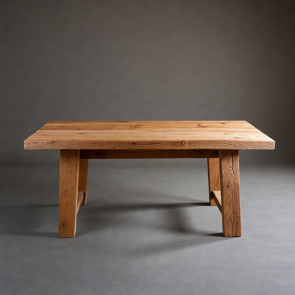 dining table, empty table, farmhouse table, furniture, gray background, hardwood table, interior design, isolated background, natural wood, oak table, rectangular table, rustic table, solid wood, table legs, wood grain, wooden furniture, wooden table