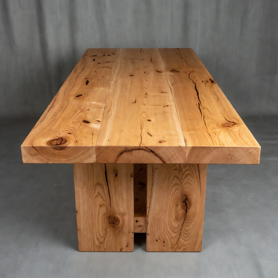 A large rectangular dining table made of natural wood with prominent grain and knots is centered in the image. It features thick, sturdy legs with a cutout design between them. The table stands on a plain gray background, highlighting its textured surface and craftsmanship.