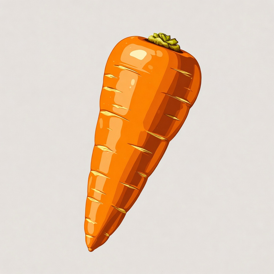 A vibrant orange carrot with green tops is depicted in a cartoon style. It features detailed ridges along its tapered body and stands upright against a plain gray background. The illustration has a glossy, shiny appearance.