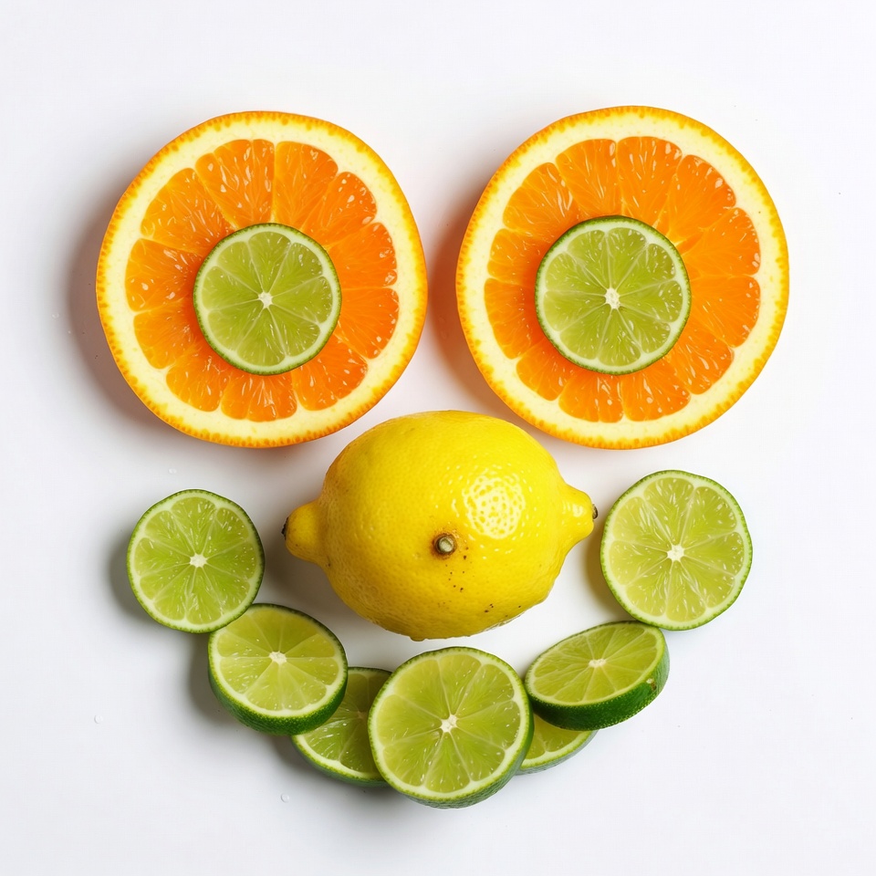 arranged fruits, citrus arrangement, citrus fruits, flat lay, food face, fresh fruit, fruit art, fruit smiley, happy face, isolated background, lemon, lime slices, limes, orange slices, oranges, slices, top view, white background, yellow lemon, smiley face