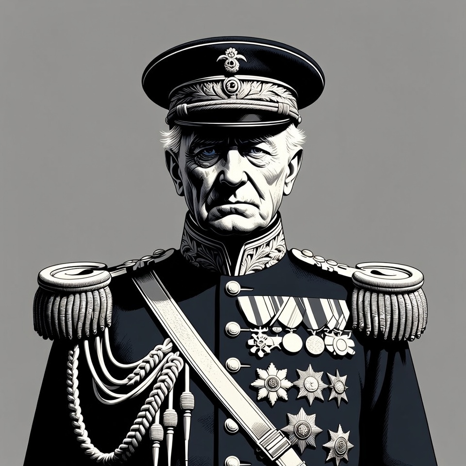 An elderly White man with white hair and mustache wears a formal military uniform and peaked cap. The uniform features ornate epaulettes, numerous medals, and decorative braiding on a gray background. He stands in a front-facing portrait style illustration.