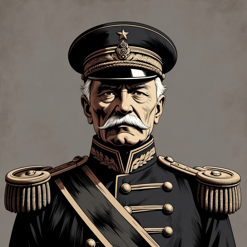 An elderly man with white hair and a thick mustache wears a dark military uniform with gold epaulets and braiding. He dons a peaked cap adorned with a star emblem and stands against a plain gray background. The illustration features a serious facial expression and detailed uniform accents.
