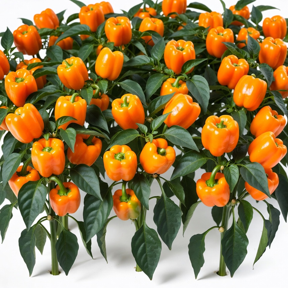 A dense cluster of vibrant orange bell peppers grows on thick green stems and leaves. The peppers are ripe and uniformly colored, arranged closely together. The plant is isolated against a white background.