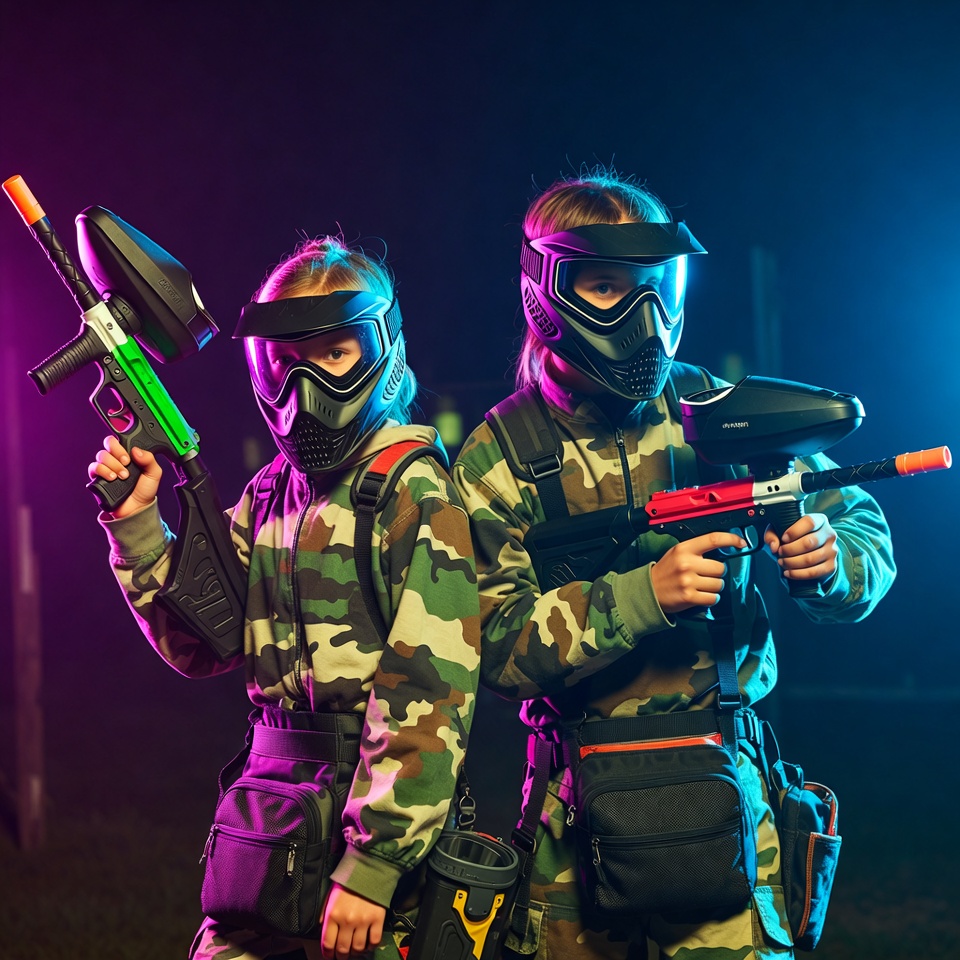 Two young girls wearing full camouflage outfits and protective masks hold paintball guns in neon-lit darkness. One girl grips a green Tippmann paintball marker while the other holds a red one, both equipped with tactical vests and pouches. They stand side by side on a dark outdoor field with purple and blue glowing lights.