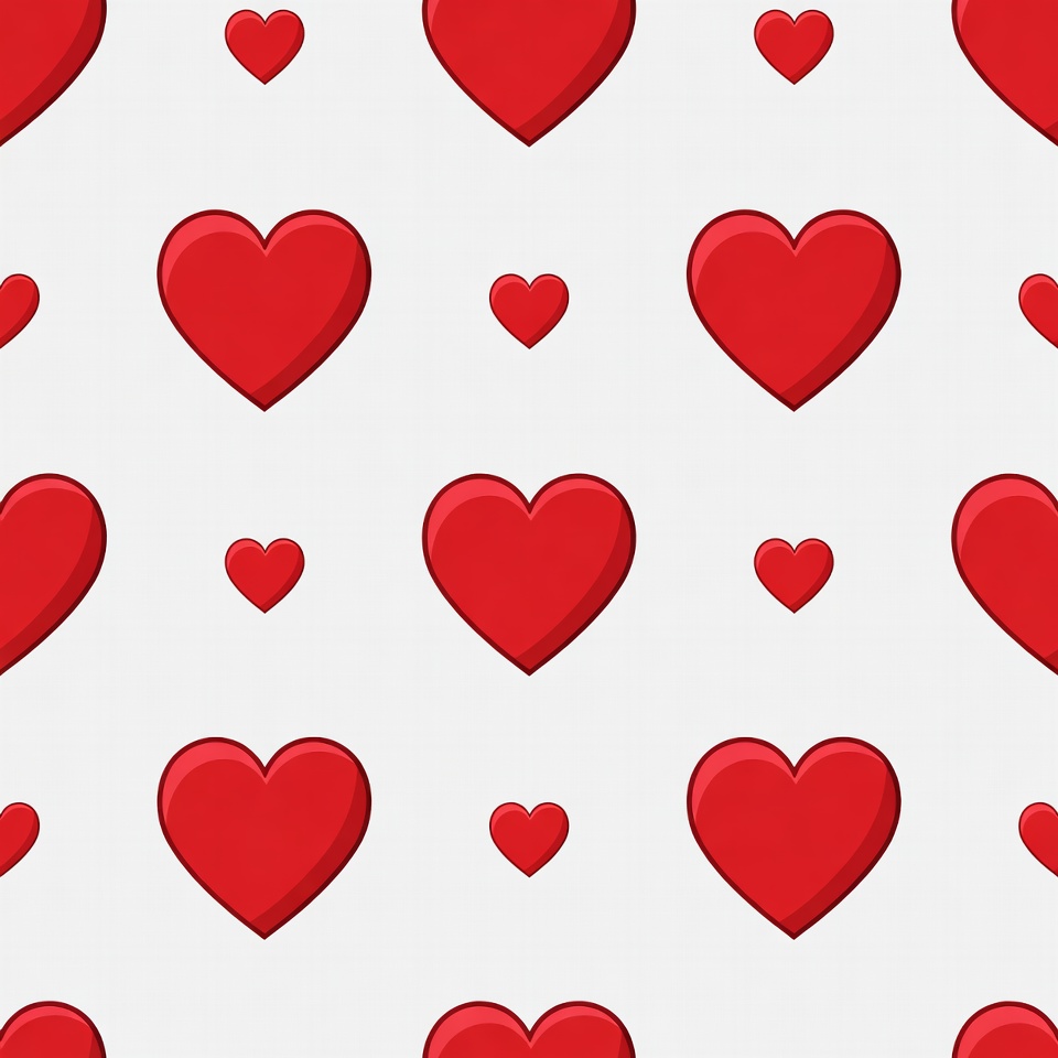 A seamless pattern features various sizes of glossy red hearts arranged on a white background. The 3D-style hearts are scattered in a repeating tile design. Smaller and larger hearts create visual depth and rhythm.