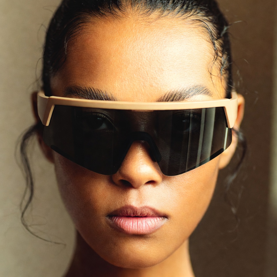 A young Black woman with hair in a high bun stares directly at the camera. She wears large futuristic beige-framed sunglasses with dark lenses. Her lips are slightly pursed in a neutral expression against a plain background.