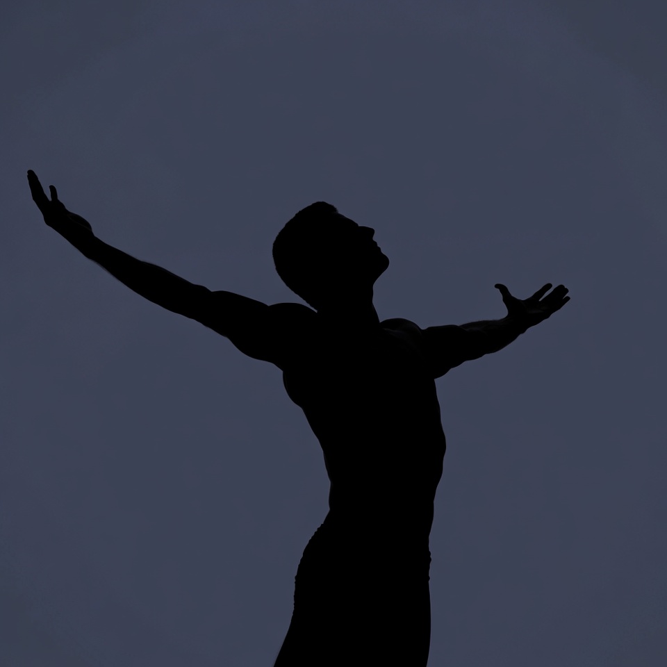 A muscular man's silhouette stands against a dark blue background. He has his arms outstretched wide above his head with hands spread open. The profile view highlights his strong build and athletic pose.