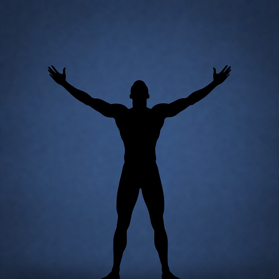 A black silhouette of a muscular man stands against a blue gradient background. He has broad shoulders, defined biceps, and strong legs, with both arms raised high above his head and palms open. The figure is centered and isolated on the textured blue backdrop.