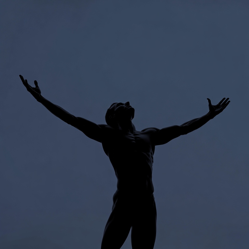 A muscular man's silhouette stands against a dark blue gradient sky with arms outstretched upward. His athletic build and raised hands create a dynamic pose. The image features sharp contrast and no facial details.