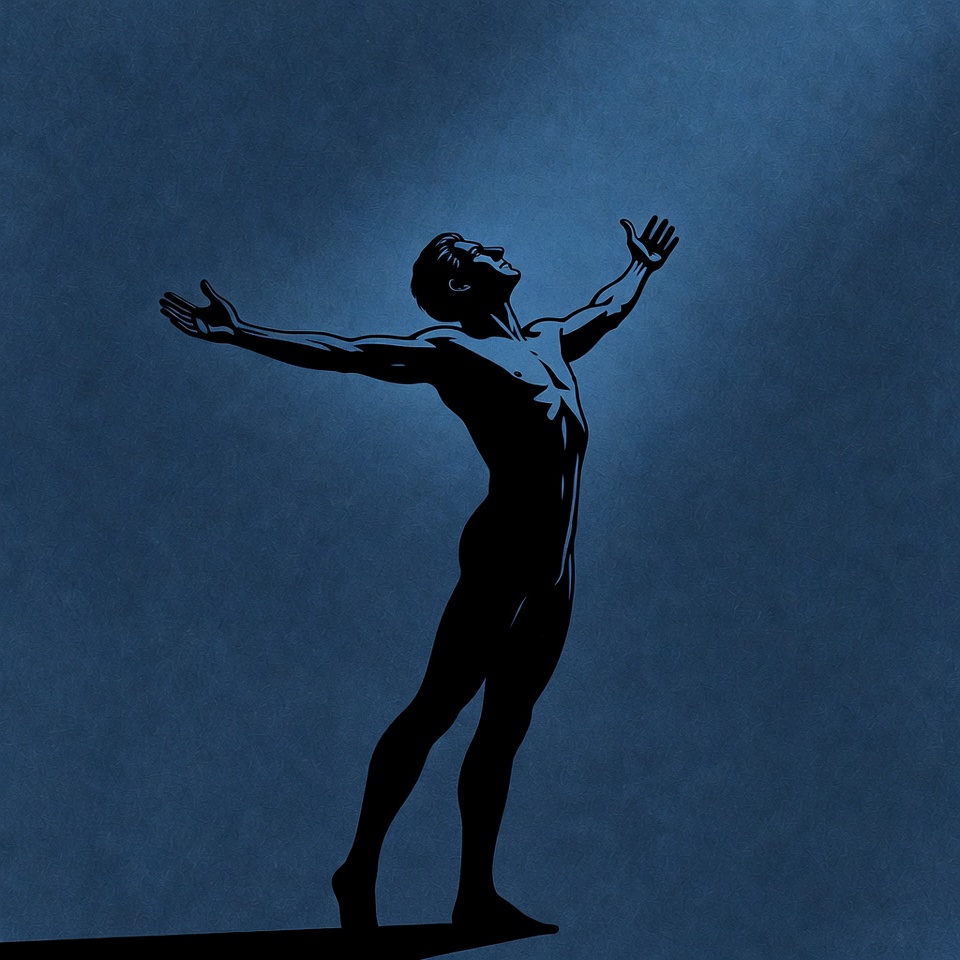 A black silhouette of a muscular nude man stands with arms outstretched upward against a deep blue gradient background. His body is athletic and toned, captured in a dynamic pose leaning slightly forward. A subtle shadow falls beneath his bare feet.